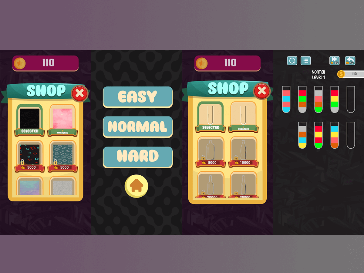 The gameplay of Water Sort Puzzle is relatively simple, but very challenging. Each bottle has a different color and amount of liquid, and players need to exchange the liquid in the bottle to separate and classify. When the player successfully separates the liquid from all the bottles into a single bottle, it clears and advances to the next level. There are different difficulties to choose from in the game, challenge yourself! In the game, successful levels are also rewarded with gold, which can be used to unlock new themes and skins.